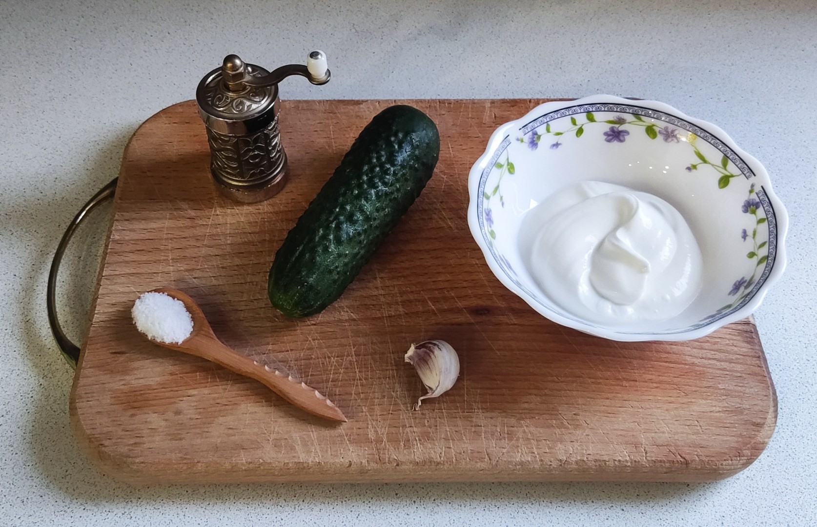 Как сделать соус с огурцом? Подготовьте продукты. Огурцов возьмите два средних, три маленьких или один большой. Сметану выбирайте качественную, натуральную, без добавления растительных жиров. Жирность может быть любая — от нее будет зависеть лишь густота готового соуса и его калорийность. Количество зубчиков чеснока будет зависеть от вашего вкуса, я взяла один.