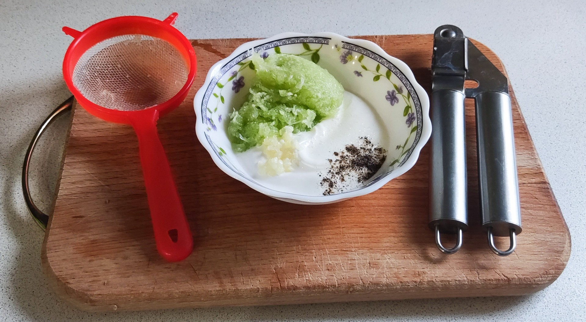 С огурца я сняла кожицу, мне показалось, что она грубая. Натёртые огурцы отжала через сито. Из зелени добавила петрушку и укроп.