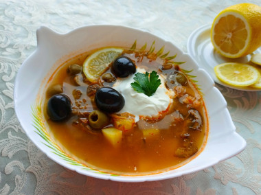 При подаче солянку обычно дополняют маслинами или оливками и ломтиками лимона.