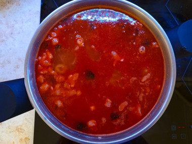 Переложите зажарку в кастрюлю. Влейте рассол. Количество рассола регулируйте по своему вкусу. Суп посолите, поперчите. Варите на среднем огне еще 10 минут.