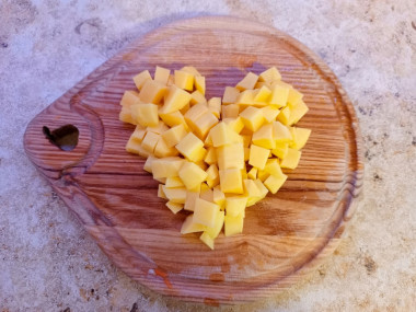 Пока варится картошка, подготовьте зажарку. Колбасу можете брать сырокопченую или варенокопченую. У меня варенокопченая колбаса. Колбасу можете дополнить или заменить другими копченостями по своему вкусу. Огурцы можете брать соленые или маринованные.