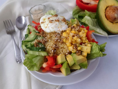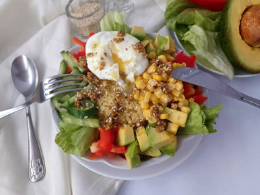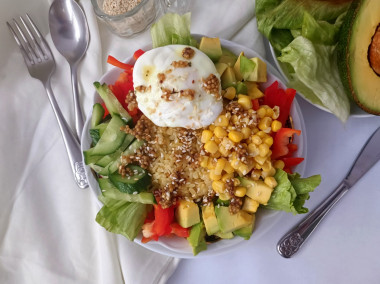Сегодня я приготовила поке боул с курицей и булгуром, а точнее с яйцом (вместо курицы, которой неожиданно не оказалось дома). Пока варился булгур, я нарезала овощи и авокадо, а из яйца приготовила яйцо-пашот. Затем я выложила в тарелку готовый булгур, по краям разложила овощи и авокадо, в центр – яйцо-пашот и немного консервированной кукурузы. В качестве заправки использовала соус из дижонской горчицы, оливкового масла и лимонного сока, после чего полила боул соусом и посыпала кунжутом.