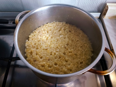 Первым делом сварите булгур. Для этого возьмите сотейник с толстым дном, поставьте его на небольшой огонь и налейте в него немного растительного масла. Всыпьте крупу, перемешайте ее, чтобы она полностью покрылась маслом. Немного обжарьте, а затем влейте кипяток. Убавьте огонь до минимума, накройте сотейник крышкой и оставьте булгур вариться примерно на 10 минут.