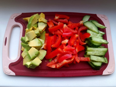 Подготовьте овощи. Авокадо разрежьте пополам, удалите косточку. Очистите его от кожуры, мякоть нарежьте на тонкие ломтики поперек.