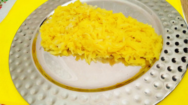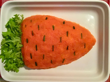 Для сборки салата выбирайте длинное блюдо. Картофель натрите на терке и выложите первым слоем, формируя форму морковки. Я сделала по краям небольшие бортики, чтобы удобней было выкладывать тунца. Этот слой и все следующие немного смазывайте майонезом.