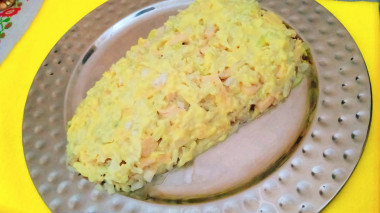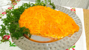 Последним слоем распределите тертую отварную морковь, покрывая ею салат со всех сторон. Прижимайте руками, подравнивая бока.