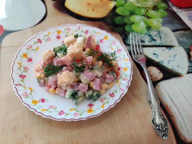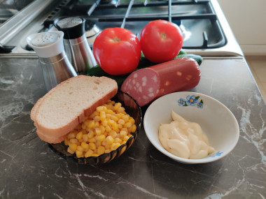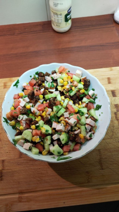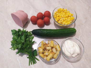 Как-то наделала много домашних сухариков, думала куда их можно применить и решила сделать салат кукуруза колбаса огурец. Колбасу взяла докторскую варёную, остальные ингредиенты добавляла чётко по рецепту. Мне понравилось, что салат состоит из обычных продуктов и его можно делать хоть каждый день. Легко и быстро я порезала всё на салат, заправила майонезом, солить не стала, было и так очень вкусно. Автору спасибо за рецепт!