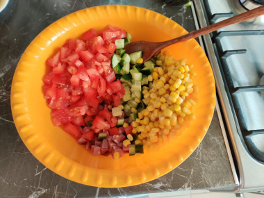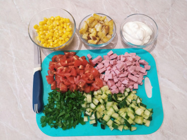 Сложите все составляющие в салатник, добавьте туда же кукурузу и сухарики. Посолите и поперчите салат по вкусу. Учитывайте только, что в его составе уже есть колбаса, и будет еще добавлен майонез, которые содержат соль. Не пересолите.