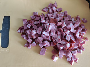С колбасы снимите оболочку. Затем нарежьте ее на мелкие кубики.