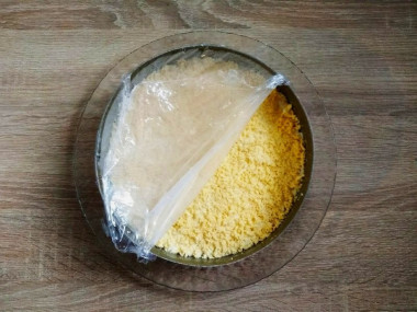 Отварные яйца разделите на белки и желтки. Оставьте 2 желтка для украшения. Все белки и один желток натрите на крупной терке и выложите в кольцо следующим слоем.