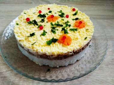 Салат удобнее выкладывать слоями в кольце. Для этого поставьте сервировочное кольцо на тарелку и выложите в него отварной рис первым слоем. Прижмите рис, чтобы слой стал плотнее. Этот слой и все следующие немного смазывайте майонезом.