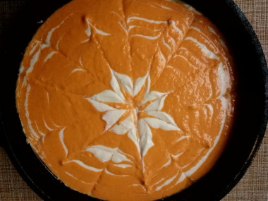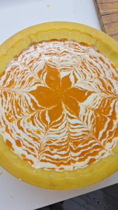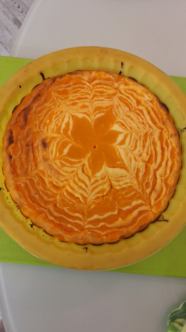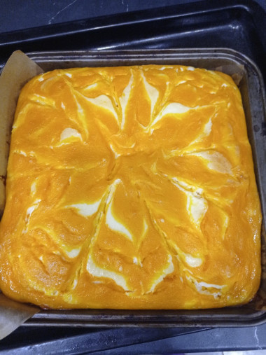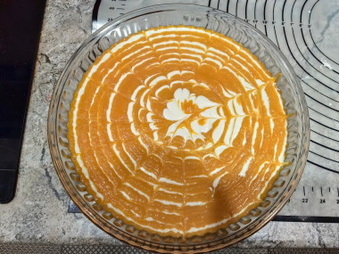 Поэтому творожную массу, как рекомендовалось в рецепте, разбавляла водой, а вот тыквенную загущала рисовой мукой. Когда же добилась примерно одинаковой консистенции начала выкладывать массы поочерёдное в форму для выпечки. Рисунок на поверхности запеканки делала шпажкой, но он получился не сильно выраженным. Видимо потому, что тыквенная часть всё таки была более жидкой и творог ушёл вниз.