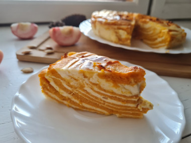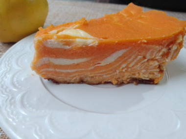 Тыкву для тыквенного слоя возьмите десертную, сладкую. Если тыква обычных сортов, то отрегулируйте количество сахара в большую сторону. Для приготовления 500 грамм пюре понадобится немного больше сырой очищенной мякоти тыквы.