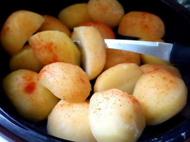 Спустя указанное время мультиварка издаст звуковой сигнал, говорящий о том, что блюдо готово. Откройте крышку. проткните картофель ножом. Картошка стала мягкая.