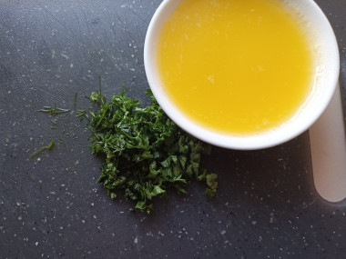 Отдельно растопите сливочное масло. Мелко нарежьте свежую зелень. Зелень можно взять любую. Это может быть укроп, петрушка или зеленый лук.