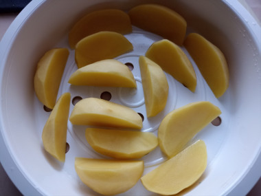 Очищенный картофель разрежьте на 2-3 части, чтобы кусочки были примерно одного размера. Чему крупнее будет картофель, тем дольше он будет готовиться. Выложите нарезанный картофель в чашу для варки на пару. Такай чаша есть в комплекте с каждой мультиваркой.