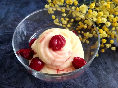 Мне очень понравился густой и ароматный заварной крем с вишней! Я его приготовила в качестве десерта. У нас в семье все любят заварной крем, но в сочетании с вишней ещё не пробовали. Крем заварила так как указано в рецепте. Густеет он очень быстро, поэтому перемешивать нужно постоянно. Как только молочная масса стала наворачиваться на венчик, нагрев прекратила и накрыла плёнкой. Быстро охладила крем и выложила в креманки. Украсила вишенками, которые предварительно разморозила. Крем очень нежный, плотный, пахнет ванилью. Я брала молоко 6%, поэтому молочно-сливочный привкус хорошо чувствуется. И масла не надо). Очень вкусно! Спасибо!