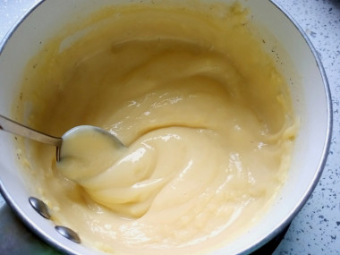 Когда от молока начнет подниматься пар, при постоянном помешивании тонкой струйкой влейте желтковую смесь. Варите крем, постоянно помешивая венчиком, до загустения. Густоту крема определяйте сами, какая вам больше нравится, но учтите, что по мере остывания крем загустеет. Я уваривала до тех пор, пока след от венчика перестал затягиваться.