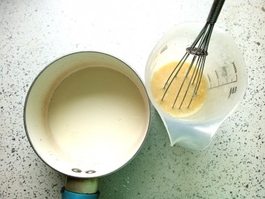 В сотейник влейте 350 мл молока. Поставьте на средний огонь и прогрейте, но до кипения не доводите.