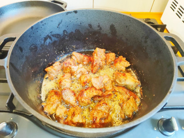 Выловите свинину с помощью шумовки в отдельную глубокую чашу, оставляя масло в казане. Аккуратно отправьте в масло лук, масло может брызгаться. Обжаривайте до золотистого оттенка на умеренно сильном огне, постоянно помешивая.