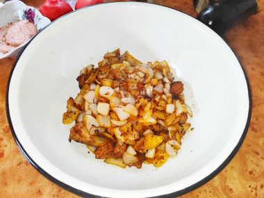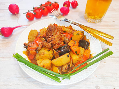 Мама в детстве готовила такое. Называли мы его просто жаренное рагу. Очень вкусно, нажористо и жирненько. Можно вместо баклажанов класть кабачки - тоже вкусно выходит. Но перестали готовить, т.к. съедать надо сразу - плохо хранится