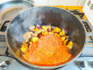 Помидоры проверните через мясорубку или пюрируйте в блендере. Влейте их к баклажанам.