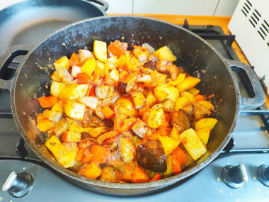 Хорошо всё перемешайте, накройте казан крышкой и готовьте на слабом огне до готовности всех компонентов. В готовом блюде все ингредиенты станут мягкими, а мясо будет легко разбираться на волокна.