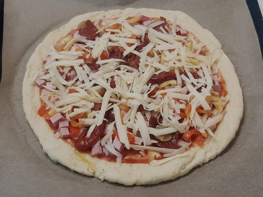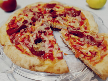 , а затем на «кулачках» вытянула до Ø30см. Бортик не формировала, по опыту знаю уже, что та часть теста, которую не смазываешь томатным соусом, в процессе выпечки поднимается, и сама его формирует. Для начинки использовала нарезанную кубиками докторскую колбасу, вяленые помидоры и сладкий болгарский перец. Все посыпала смесью специй для пиццы и натертым на крупной терке твердым сыром. Пицца получилась мягкая, вкусная и ароматная! За тесто отдельное спасибо Юлии, очень удачное для пиццы!