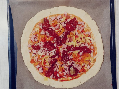 Тесто раскатайте на пергаменте в круглый пласт. Сформируйте небольшие бортики. У меня диаметр пиццы до выпечки 23 см.