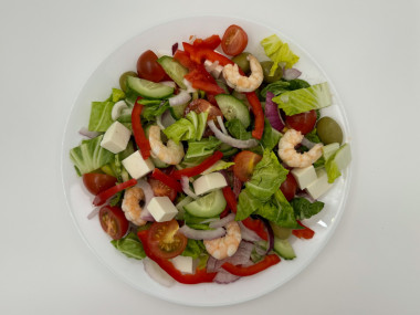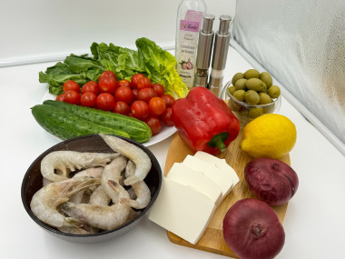 Греческий – один из самых любимых салатов в нашей семье, но с креветками мы его ещё не готовили.