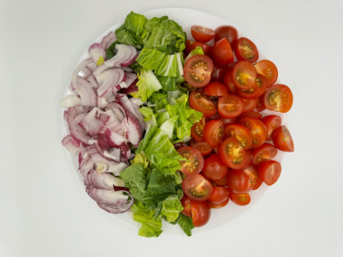 Помидоры вымойте, обсушите и нарежьте дольками. По желанию, чтобы салат был менее водянистым, можете удалить сердцевину с семенами. Если у вас помидоры черри - нарежьте их половинками. Помидоры нужны сочные, но плотные. Мягкие плоды плохо держат форму, в процессе нарезки и приготовления они расползутся в бесформенную массу и испортят внешний вид блюда.