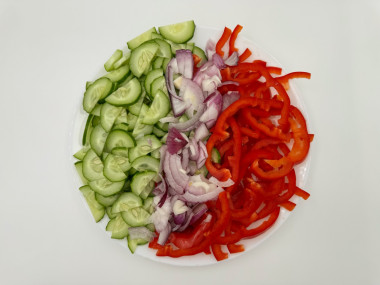 Небольшую красную луковицу очистите и нарежьте тонкими кольцами или полукольцами. У меня половинка от крупной луковицы.