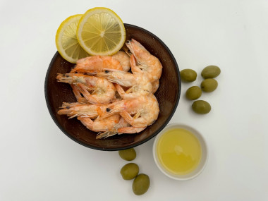 Процесс приготовления занял немного времени. Креветки приготовила как указано в рецепте, они получились мягкими и хорошо очищались. Овощи нарезала приблизительно одинакового размера. Соединила креветки с лимонным соком, оливковым маслом с чесноком и добавила к нарезанным овощам, затем выложила оливки, посыпала солью, перцем по вкусу и полила оливковым маслом получившийся салатик.