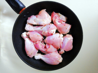 Для жарки разогрейте сковороду до горячего состояния и налейте на неё немного растительного масла. Выложите филе бедер и жарьте на среднем огне, не переворачивая 8-10 минут. Мясо начнет снизу подрумяниваться.