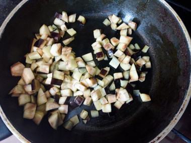 Через полчаса с момента замачивания баклажанов в соленом растворе, откиньте их на дуршлаг и дайте стечь жидкости. В это время разогрейте на сковороде растительное масло. Когда масло разогреется, выложите на сковороду кубики баклажанов и обжарьте их в течение 15 минут, не забывая периодически помешивать. У баклажанов должна появиться поджаренная корочка.