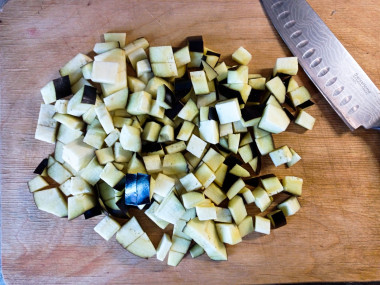 Баклажаны промойте под проточной водой, обрежьте носик и хвостик, нарежьте их кубиками среднего размера, где-то 1х1см. По желанию нарезать баклажаны можно и другим способом, но такая нарезка очень удобна при употреблении. Подготовьте раствор для замачивания баклажанов: смешайте воду с солью. Нарезанные баклажаны залейте соленым раствором и оставьте их на 30 минут в стороне. Такая процедура подготовки баклажанов позволит избавить готовое блюдо от горечи.