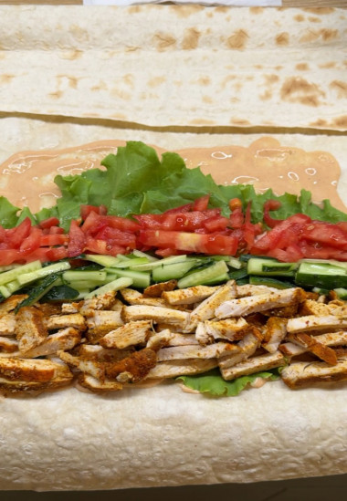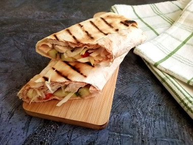 Я не специалист по шаурме, даже пробовала ее всего один раз. Но в холодильнике остались продукты от праздника и я решила сделать ПП шаурму с курицей в лаваше. Лаваш у меня был прямоугольный, на него удобно выкладывать начинку. Куриное филе было запеченное заранее, в остывшем виде его легко нарезать на брусочки. Листья салата оказывается можно заменить на капусту, что я и сделала. А вместо помидора взяла полоски свежего перца. Соус у меня получился более красным из-за добавления томатной пасты. Завернутую шаурму выложила на сковороду-гриль для появления полосочек. Получилось очень вкусно! Соуса я бы добавила побольше, а в остальном сочные овощи отлично сочетаются с пряной курицей. Сверху получилась хрустящая корочка, мне понравилось). Буду тренироваться в приготовлении домашней шаурмы, уж больно вкусное блюдо.