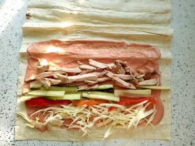 Подверните края лаваша и сверните его в рулет, аккуратно подворачивая начинку. Аналогично сделайте шаурму из второго лаваша.