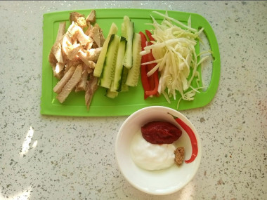 Положите на соус листья салата (или нарезанную капусту). Выложите сверху нарезанные мясо и овощи. Старайтесь класть кусочки так, чтобы они смотрели в одну сторону, получится аккуратнее. Овощи сверху слегка присолите.