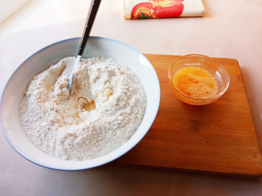 Оставьте тесто на пару минут постоять, чтобы оно немного остыло, затем вбейте в него яйцо. Начните месить тесто сначала вилкой, затем руками. Вот сейчас вы и поймете, что надо добавить в тесто — муку или жидкость. У меня тесто получилось липким, я досыпала еще немного муки.