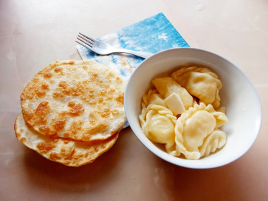 Приготовила заварное тесто для вареников на кипятке по этому рецепту. В просеянную муку влила растительное масло, а яйцо слегка взбила с солью и добавила в муку. Заварила тесто кипятком. Тесто получилось мягкое, эластичное, вымешивается гораздо легче и быстрее, чем на холодной воде. И ещё - приятный бонус! Из этого теста получились замечательные тоненькие лепешки к чаю или к первым блюдам. Обязательно попробуйте! Раскатывать как можно тоньше( с таким тестом это легко!) и жарить на сковороде с небольшим количеством растительного масла.
