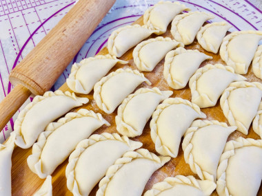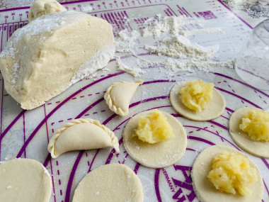 Готовое тесто раскатайте в тонкий пласт, удобнее будет делать это порциями. Нарежьте пласт кружочками, положите в центр начинку и слепите вареники. Я готовила вареники с картофельным пюре. Тесто отлично тянется, лепится и не прилипает к рукам.