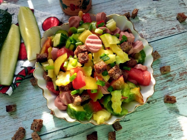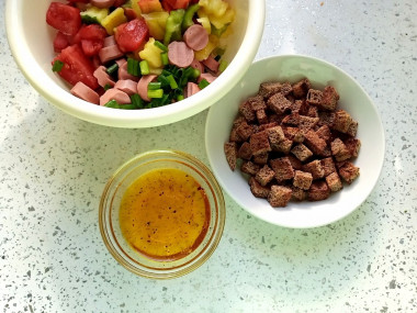 Огурцы и помидоры нарезала небольшими кусочками. Колбасы не было, зато были хорошие тонкие сосиски, как раз по размеру подошли. Отварила их и тоже нарезала кусочками. У меня еще было два цветных сладких перчика, они очень просились в салат) Все что можно было резала фигурным ножом для настроения. В качестве зелени взяла зелёный лук. Сухарики решила сделать из бородинского хлеба. Мне кажется чёрный хлеб лучше всего подходит к этому салату. Сухари сушила на сухой сковороде пока резала овощи. На самом деле все очень быстро делается, это удобно. Заправку сделала из горчичного ароматного масла, яблочного уксуса и свежемолотого перца. Салат невероятно сочный, лёгкий, яркий и вкусный. Можно подать к любому блюду или использовать в качестве перекуса.