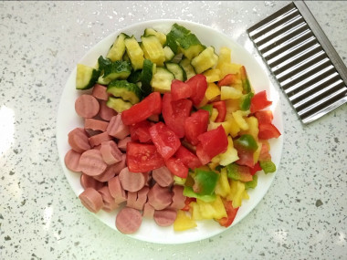 Ветчину нарежьте кубиками и соедините с помидорами и огурцами.