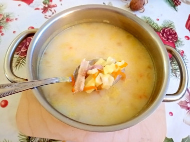 Плавленый сыр натрите на терке или нарежьте тонкой соломкой для более быстрого растворения и добавьте в суп за 5 минут до готовности.