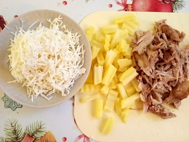 Через 15 минут после закипания, извлеките мясо из кастрюли, чтобы оно немного остыло. В бульон добавьте нарезанный картофель, лавровый лист и перец горошком, посолите.