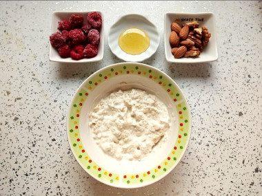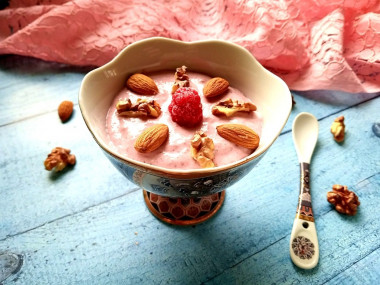 Сегодня на завтрак сделала себе ПП десерт без сахара выпечки и муки. Получилось очень вкусно и сытно! Рано утром хлопья смешала с не сладким йогуртом и поставила в холодильник на два часа. А потом уже приступила к приготовлению завтрака. Кстати йогурт полностью впитался в хлопья. Хотела даже разбавить, но не стала, ведь будут добавляться ягоды. Овсяную массу взбила с замороженной малиной, грецкими орехами и миндалем. Чайной ложки меда для сладости мне вполне хватило. Десерт получился густым, воздушным и нежным. Единственное что мешало, это косточки малины) Во вкусе преобладают ягоды. Завтрак у меня получился сытным, сил надолго хватило. Теперь надо попробовать с клубникой и смородиной.