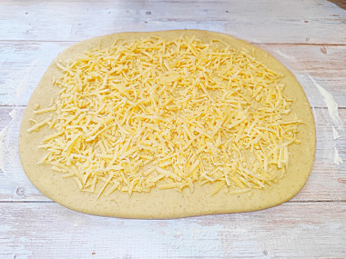 Тесто раскатайте на присыпанном мукой столе в прямоугольный пласт размером 35x25 см. Равномерно посыпьте сверху тертым сыром.