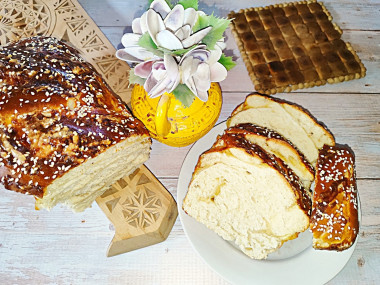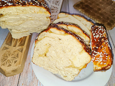 Сырный хлеб очень сдобный, на молоке со сливочным маслом и яйцами. Я выпекала его на пшеничной закваске.