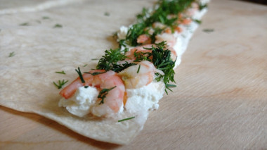 Креветки отварить в кипящей подсоленой воде в течении пяти минут, очистить. Лаваш намазать творожным сыром, выложить на его край креветки. Свернуть в виде рулетика. Вот и все! Очень просто и очень вкусно, подавайте рулетики с творогом! Приятного аппетита!